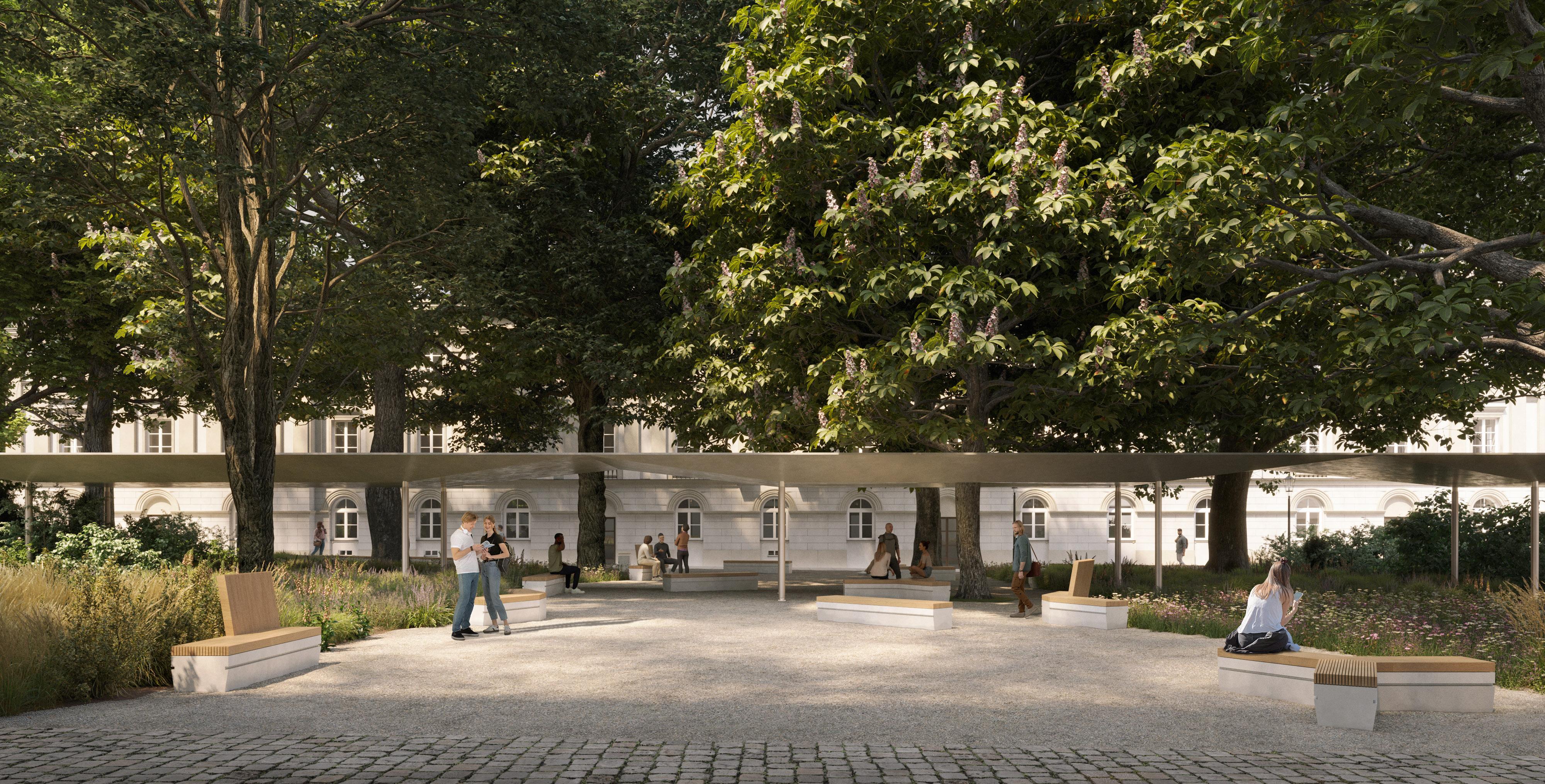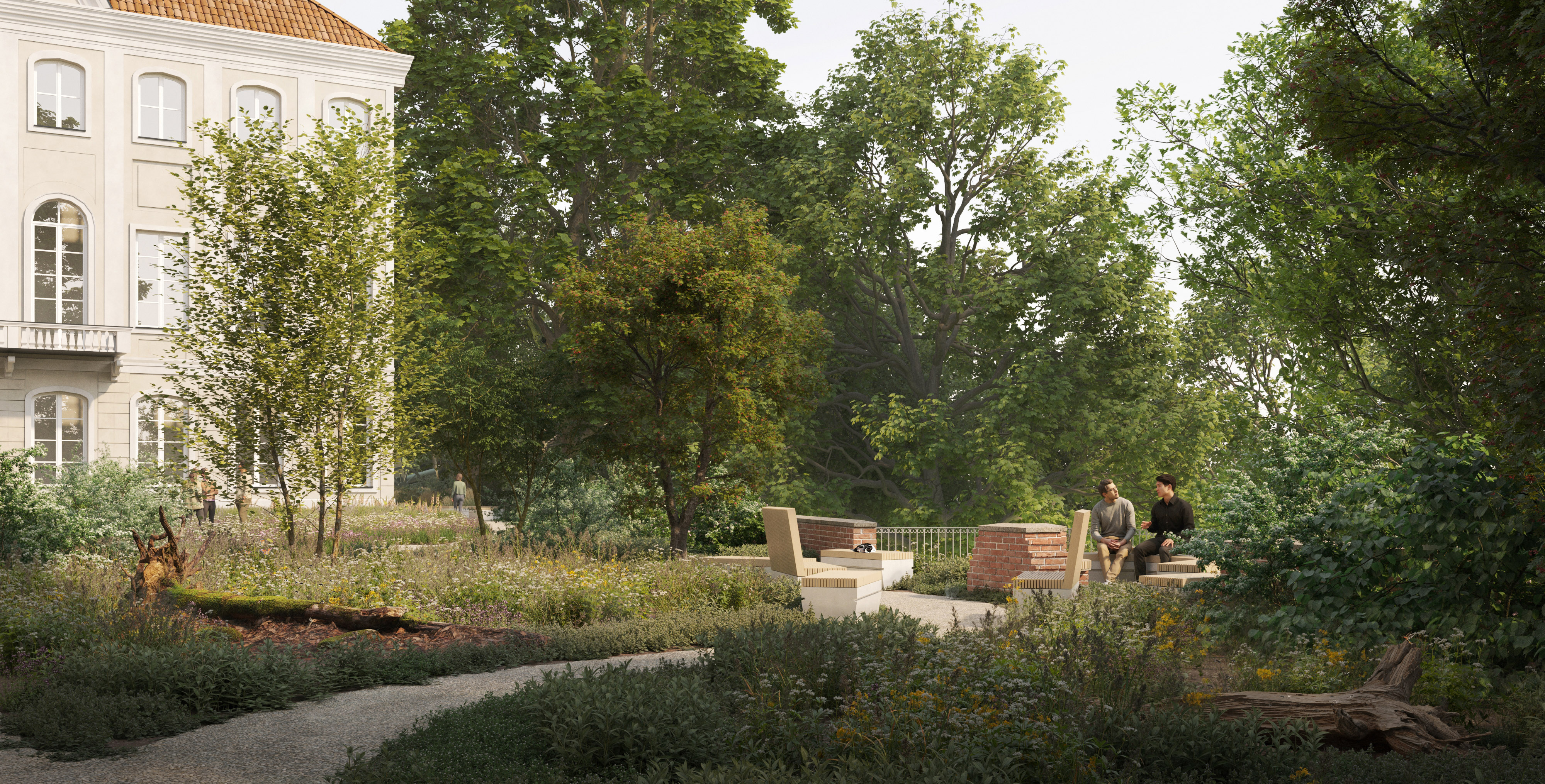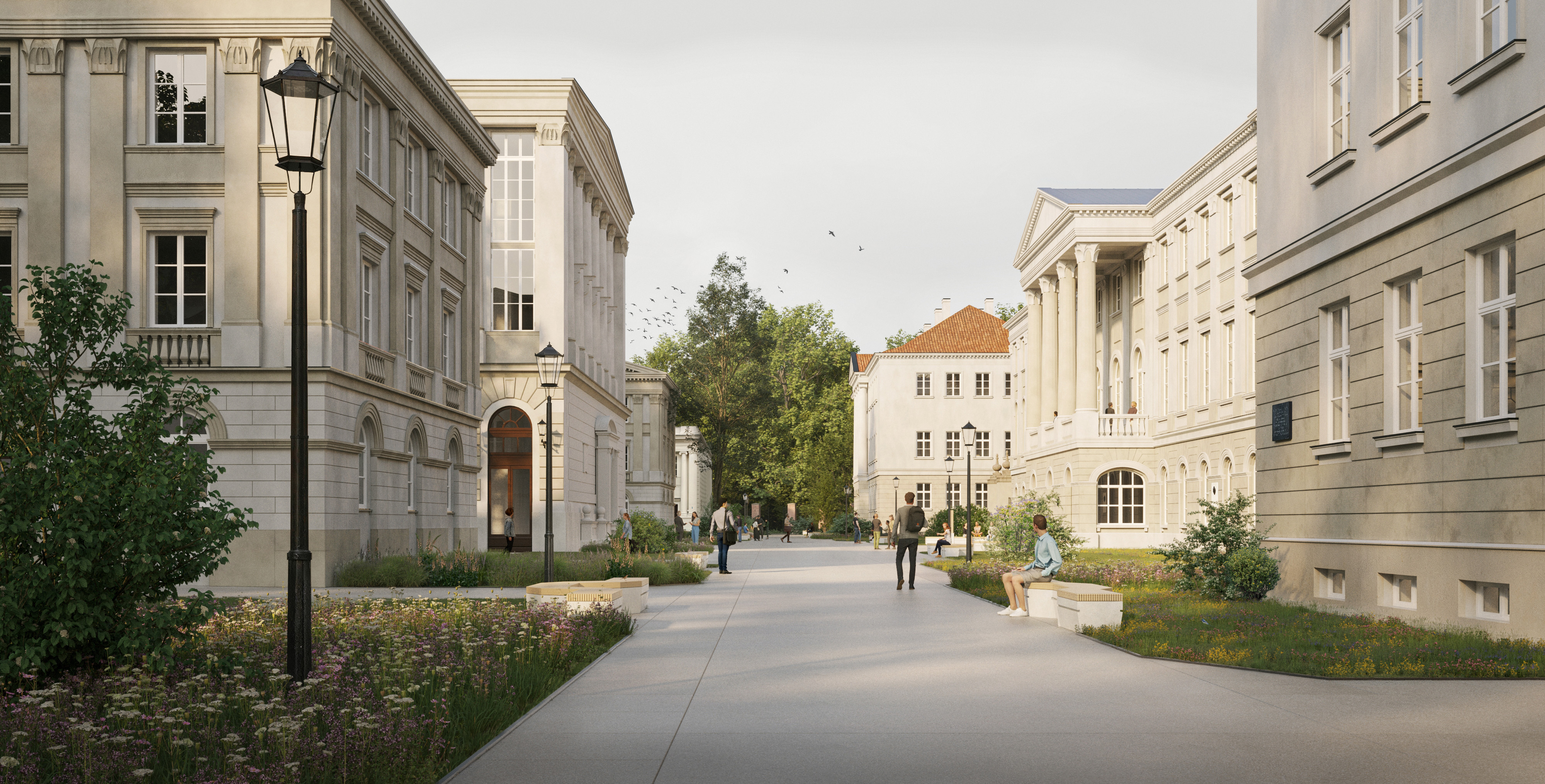 Główną ideą projektu jest powiązanie historycznego założenia ogrodowo-pałacowego z nowoczesnym podejściem do projektowania ogrodów izielonych przestrzeni miejskich. Z jednej strony odwołujemy się do historii, przywracając osiowość kompozycji w różnych skalach. Z drugiej - wprowadzamy element „urban wild”: roślinność rozwijającą się swobodnie, lecz w ramach prostych, rygorystycznych linii symetrycznego założenia. Naszym celem było stworzenie przestrzeni zachęcającejzarówno do nauki, jak i odpoczynku na świeżym powietrzu – w „Ogrodzie Wiedzy”,inspirowanym starożytnym Gajem Akademosa i pierwszym Ogrodem Botanicznym UW. Tosieć nieformalnych ścieżek, zielonych „pokoi” i otwartych placyków. Całość uzupełnia mozaikowy układ roślinności - odnajbardziej reprezentacyjnych, poprzez miejsca wypoczynku aż po strefy dzikie,znajdujące się na skraju Kampusu.