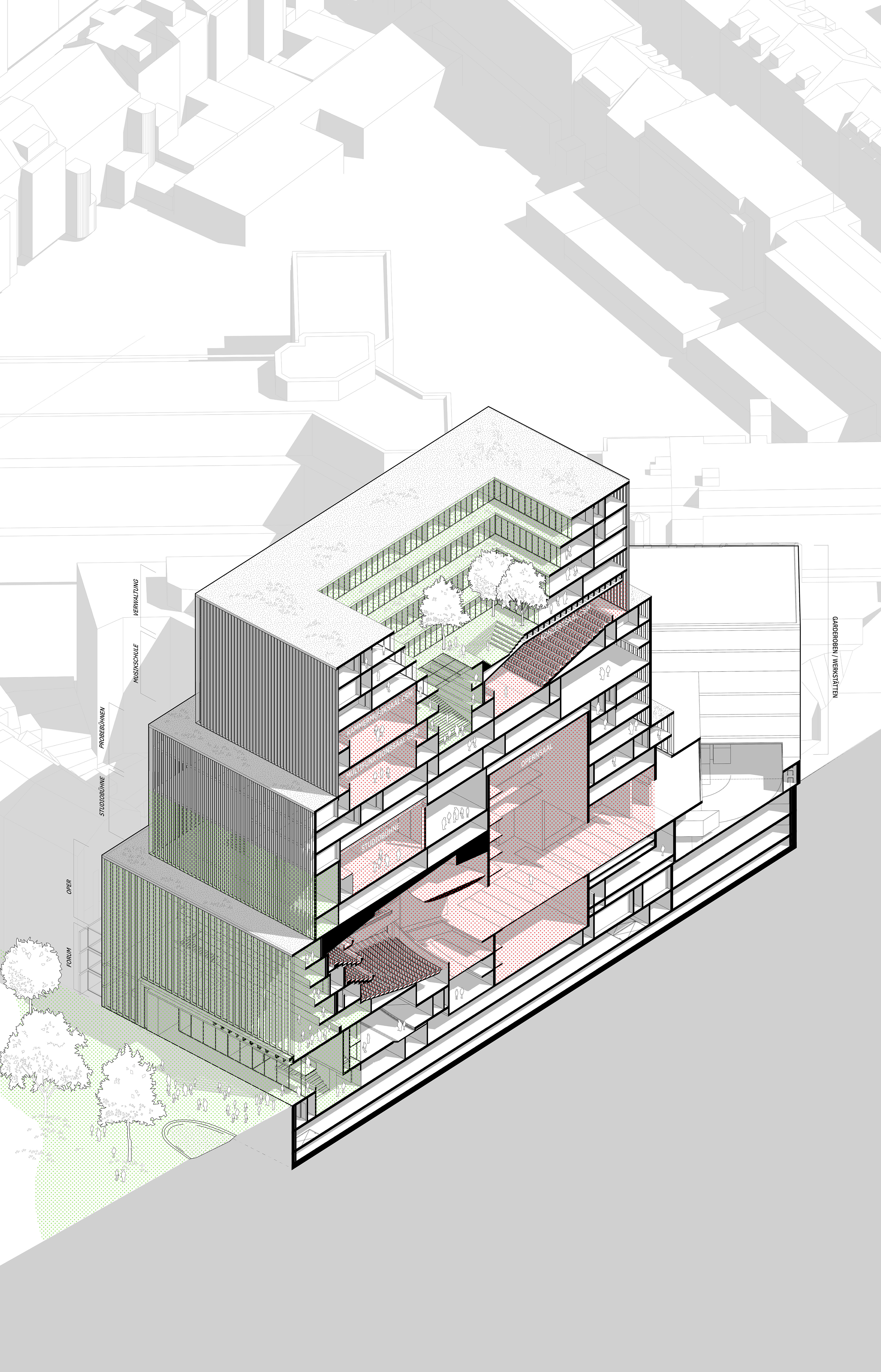 „Opera przyszłości” jest miejscem współdzielonym i różnorodnym, o ponadczasowym języku formy. Wartości leżące u podstaw projektu, bezpośrednio wyprowadzone z miejskiego kontekstu Düsseldorfu, tworzą środowisko otwarte i przyjazne dla wszystkich. Obecna lokalizacja opery nad Renem stanowi inspirujący punkt odniesienia. Jako jeden z wielu obiektów kultury, w bliskim sąsiedztwie Hofgartenu, tworzy ona inkluzywną strukturę łączącą naturę, wypoczynek i kulturę. Nowy budynek przejmuje te wartości i – w duchu „forum” – współdzieli je z innymi instytucjami. Forum tworzy sekwencję zróżnicowanych wnętrz otwartych na tereny zielone. Reprezentacyjne, przestronne strefy przeplatają się z kameralnymi, nastrojowymi miejscami, odpowiadającymi na różnorodne potrzeby użytkowników. Forum rozciąga się wzdłuż ulic na poziomie parteru i rozwija się ku górze, łącząc ze sobą wyżej położone kondygnacje. Prosta idea stworzenia uniwersalnej, przyjaznej człowiekowi przestrzeni wydaje się szczególnie adekwatna dla miejsca o ponadregionalnym znaczeniu. Dzięki swoim wartościom przestrzennym, lokalnym i instytucjonalnym nowa „Opera przyszłości” zostaje trwale wpisana w kulturowy kontekst Düsseldorfu.