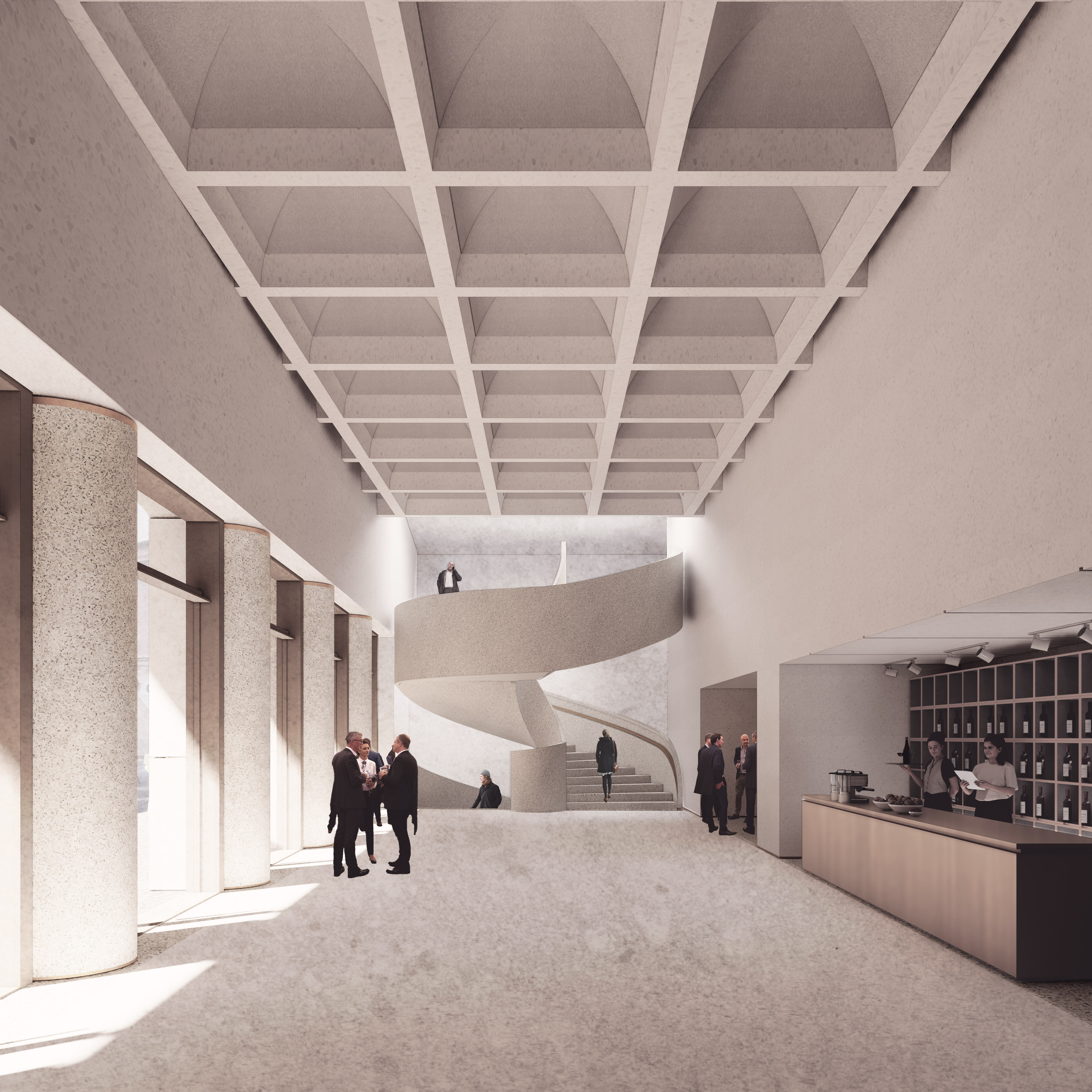 Lokalizacja Teatru w strefie historycznego centrum Lublina tworzy potencjał ożywienia sąsiednich ulic. W związku z tym w parterach budynków przewidzieliśmy wszystkie funkcje o charakterze miastotwórczym - tj. foyer nowej sceny wraz z punktem sprzedaży biletów od strony ul. Peowiaków oraz kawiarnię otwierającą się na wewnętrzny dziedziniec i ulicę Kapucyńską. Historyczne foyer pozostaje główną strefą wejścia do teatru, jednak nowe uzupełnienia zabudowy tworzą otwartą na miasto strukturę, czytelnie sygnalizując wejście do nowej sceny oraz na dziedziniec.