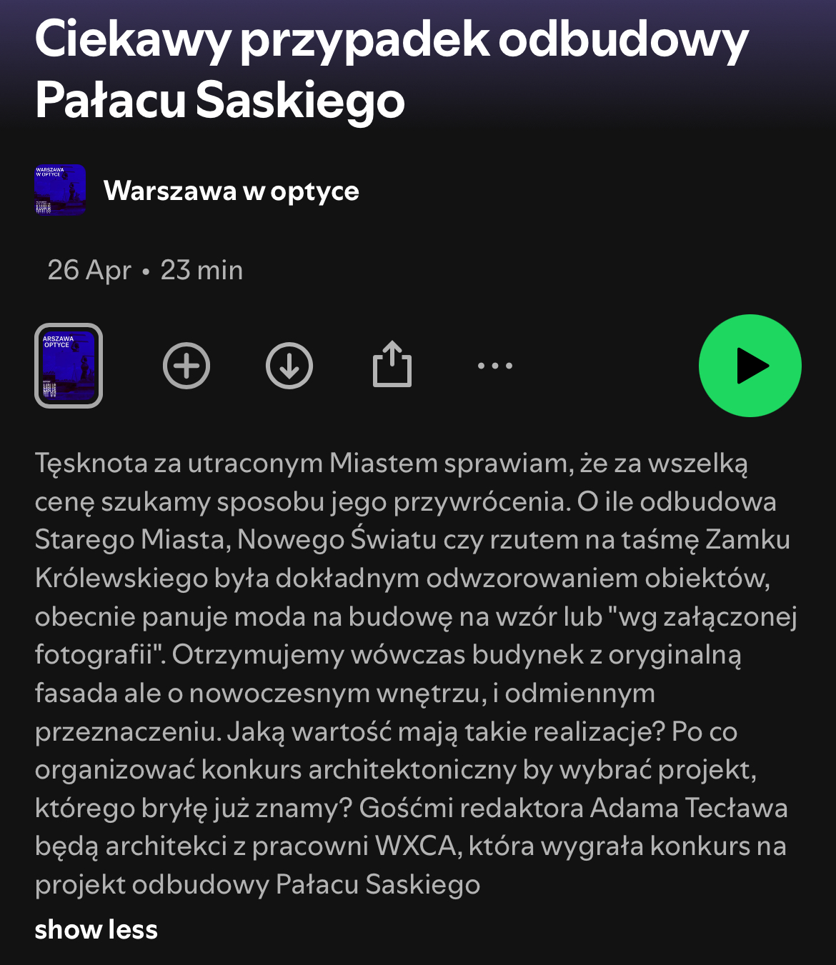 Małgorzata Dembowska i Piotr Hardt w rozmowie z Radio Kampus, w audycji "Warszawa w optyce" opowiadają o przedsięwzięciu odbudowy Pałacu Saskiego i Pałacu Brühla oraz o urbanistycznej, symbolicznej i społecznej potrzebie zagospodarowania przestrzeni pl. Piłsudskiego.